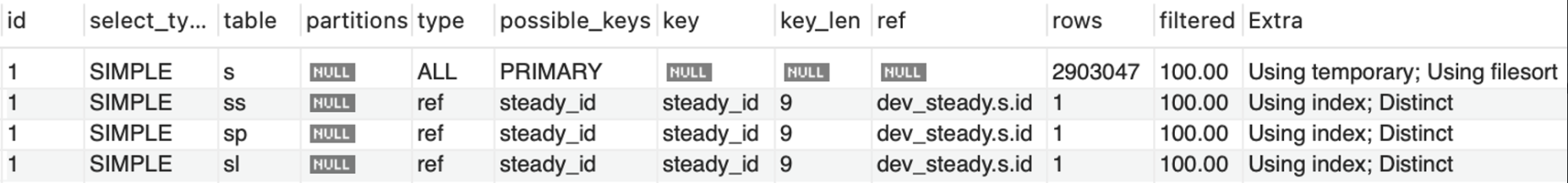 MySQL의 경우 외래키에도 `Index`를 생성해주기 때문에 외래키를 통해 Join 되는 테이블들을 조회할 때는 인덱스 전략이 사용되고 있는 것을 확인할 수 있습니다. 반면에 메인 SELECT 쿼리에 해당하는 steady 테이블의 경우 인덱스 전략이 사용되지 않았으며, `Using temporary, Using filesort` 전략이 사용된 것을 볼 수 있습니다.