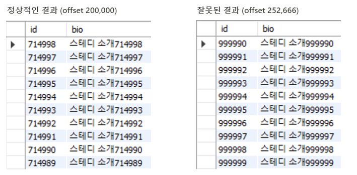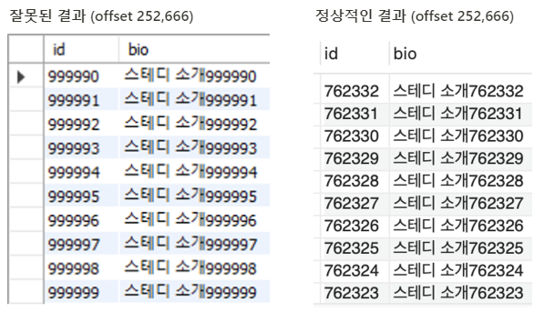 최종적으로 Deferred Join을 적용한 쿼리에서 offset을 `252,666` 보다 크게 설정하게 되면 아래와 같이 잘못된 결과를 반환하는 문제가 발생하게 되었습니다.
