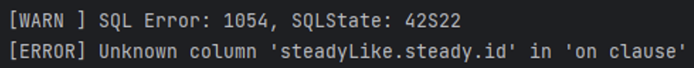 실행 결과 위와 같은 오류를 만나게 되었습니다. 이는 QueryDsl : SQL 에서는 QueryDsl : JPA를 통해 생성된 QClass의 객체 그래프 탐색이 동작하지 않기 때문이었습니다. 이를 해결하기 위해서는 QClass를 이용하지 않고 직접 `Expressions` 를 통해 직접 컬럼의 경로를 지정해주어야 했습니다.
