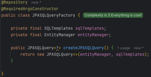 반면에 JPASQLQuery의 경우 Factory 클래스가 아니며 앞서 @Configuration 에서 정의한 것을 주입 받아 싱글톤으로 사용하고있어 초기화가 일어나지 않으며, 당연히 내부에 QueryMetaData 역시 그대로 남아있어 쿼리가 결합되는 문제가 발생하는 것이었습니다.