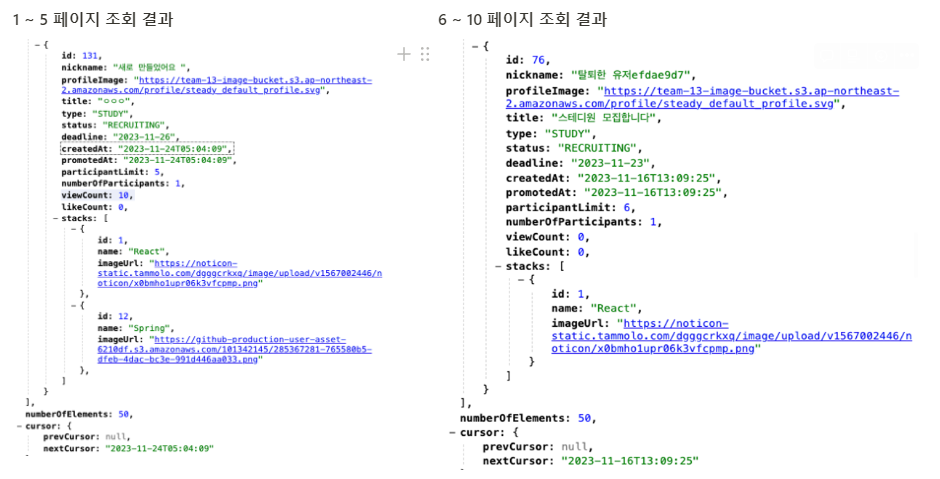 - 첫 번째 쿼리에서 부등호를 `<=` 으로 변경하면 커서에 해당하는 데이터가 다음 페이지에도 중복되어 보여지기 때문에 이를 방지하고자 `<` 부등호를 사용해야 한다.