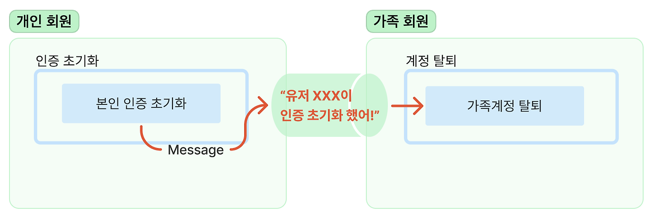 반면에 위 그림은 `인증 초기화` 라는 도메인 이벤트 그 자체를 발행함으로써 더 이상 가족 계정 시스템의 정책을 알지 못합니다. 즉, 가족 회원 서비스에 변경이 발생하더라도 개인 회원 서비스는 더 이상 영향을 받지 않는 느슨한 결합 구조를 취하게 되는 것입니다.