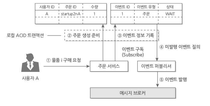 다만, 위 그림대로만 구현하는 경우 이벤트 발행에 대한 보장을 할 수 없다는 문제점이 있습니다. 메세지 브로커의 장애로 이벤트 발행이 보장되지 않는다면 이벤트 발행이라는 비관심사에 의해 주요 관심사인 비지니스 로직이 실패하게 되는 상황이 발생하게 됩니다.