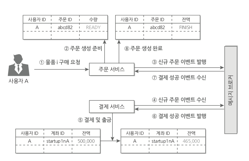 위 그림과 같이 사용자 A가 물품 i에 대하여 주문을 요청하게 되면 주문 서비스는 신규 주문에 대한 레코드를 기록하고 이에 해당하는 이벤트를 발행합니다. 이 이벤트는 메세지 브로커에 전달되어 해당 이벤트를 구독하고 있던 결제 서비스에게 전달되어 결제 및 출금 트랜잭션을 수행하게 됩니다. 결제 및 출금 작업이 성공하게 되면 결제 서비스는 다시 결제 성공에 대한 이벤트를 발행하고, 이를 주문 서비스가 수신하여 주문 생성을 완료하게 됩니다.